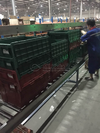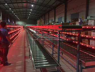 拆零部分:對(duì)于便利店來(lái)說(shuō)拆零是大的揀貨工作量。該區(qū)域共設(shè)計(jì)四個(gè)作業(yè)大區(qū)12個(gè)作業(yè)小區(qū),目前只有八個(gè)作業(yè)人員。系統(tǒng)設(shè)計(jì)為區(qū)域聯(lián)動(dòng)接力式揀貨,采用流利式貨架作為貨物擺放載體配合兩條無(wú)動(dòng)力作業(yè)線一條動(dòng)力作業(yè)線及一條空箱回收線(皮帶輸送機(jī))。同時(shí),該方案中提供了緊急補(bǔ)貨提醒功能,使補(bǔ)貨作業(yè)更為迅速。
